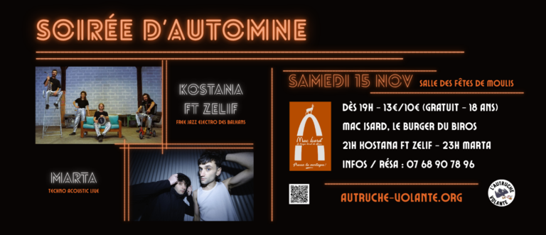 Pour cet automne l’Autruche Volante vous propose une soirée concerts le samedi 15 novembre à la salle des fêtes de Moulis ! Réservez dès maintenant sur ce lien !